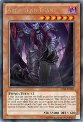 If this face-up card on the field would be destroyed by a card effect, you can pay 500 Life Points instead. This effect can only be used once while this card is face-up on the field. If this card is destroyed by a card effect and sent to the Graveyard: You can Special Summon 1 "Archfiend" monster from your hand.